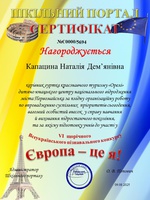 Подяка Наталії Капацині за підготовку учасників Всеукраїнського пізнавального конкурсу "Європа - це я"